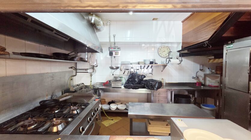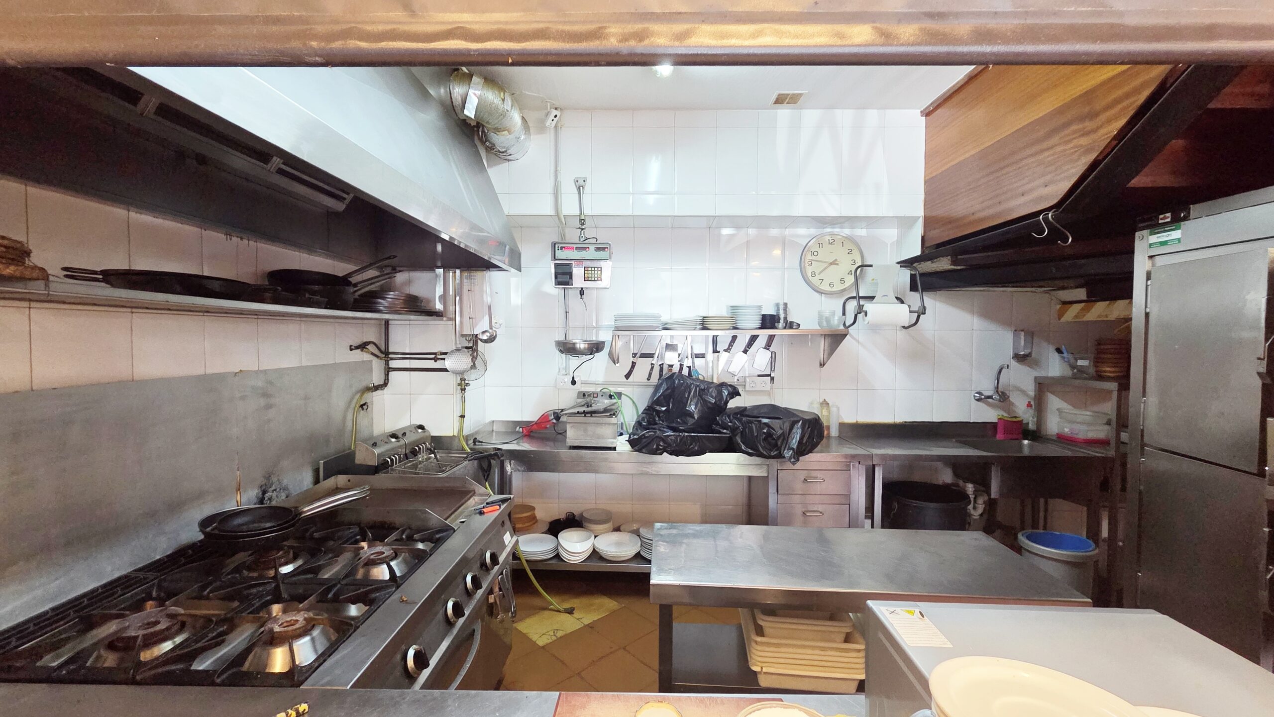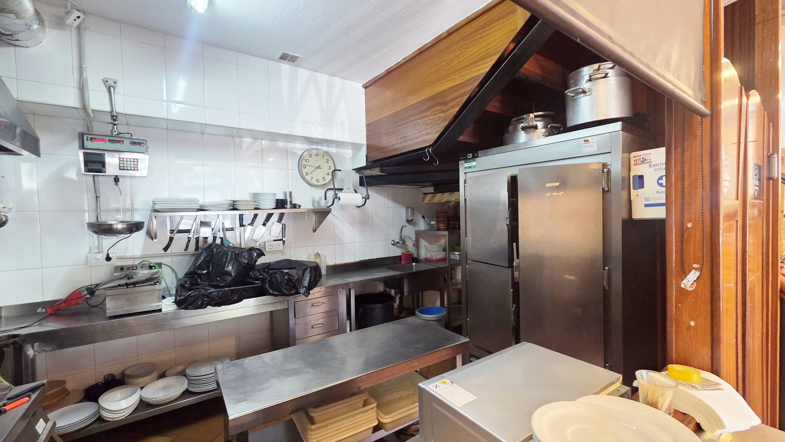 Cocina con salida de humos, equipada con todos los utensilios, DISPONE DE GAS CIUDAD, PARA SUS FOGONES, PLANCHA Y HORNO, también para su CALENTADOR DE ACS. Amplia campana extractora. LA COCINA ESTÁ VISTA AL PÚBLICO que a parte de proporcionar mucha luz natural, este tipo de cocina es ALTAMENTE valorado por los más comensales más exigentes. También puede ocultarse gracias a estor opaco. Dispone de varias mesas de trabajos, todo en acero inoxidable, fácil limpieza, durabilidad e higiene. Las FREIDORAS tampoco podían faltar, varios y amplias neveras verticales y hasta una pesa de alta precisión.